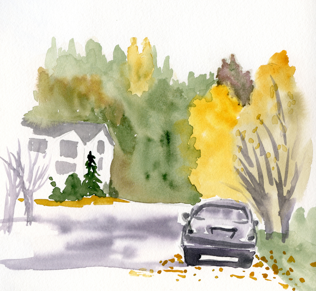 In the final sketch, all the green trees in the background hills were just as dark as the tree in front of the house, but to push them back, I made them much lighter as well as less intense. This was tough for me because both my brain and my eyes were telling me that I should make them darker to match reality. (I’m used to fighting my brain to avoid drawing what I think I see, but I’m not used to fighting my eyes, too.) Ultimately, I decided that the sketch was better and had more depth the way I’ve painted it. It was an excellent lesson in using artistic license to create the effect I want to achieve – not simply trying to replicate what I see.
